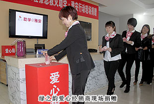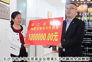 4月24日上午,在共青團(tuán)長(zhǎng)沙市委、長(zhǎng)沙市青少年基金會(huì)聯(lián)合舉行的“希望工程緊急救災(zāi)助學(xué)?雅安行動(dòng)”現(xiàn)場(chǎng)捐贈(zèng)儀式上,湖南省政協(xié)委員、長(zhǎng)沙市光彩事業(yè)基金會(huì)理事長(zhǎng)、綠之韻集團(tuán)董事長(zhǎng)胡國(guó)安代表集團(tuán)公司向長(zhǎng)沙市青少年基金會(huì)捐款100萬(wàn)元,救災(zāi)助學(xué),向?yàn)?zāi)區(qū)的孩子們送去綠之韻人的關(guān)愛(ài)與溫暖。同時(shí),長(zhǎng)沙市政協(xié)委員、綠之韻國(guó)際集團(tuán)(東南亞)股份有限公司總經(jīng)理張曉琴代表綠之韻善德國(guó)際向長(zhǎng)沙市青少年基金會(huì)捐款50萬(wàn)元人民幣,并在儀式現(xiàn)場(chǎng)組織綠之韻善德經(jīng)銷商代表再次進(jìn)行了募捐活動(dòng)。