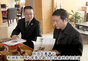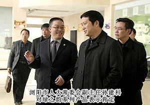 2013年1月25日上午,瀏陽市人大常委會(huì)副主任孫建科、瀏陽市人大常委會(huì)秘書長唐林軍一行蒞臨綠之韻集團(tuán)考察指導(dǎo)工作,胡國安董事長全程陪同考察組參觀了綠之韻集團(tuán)總部。