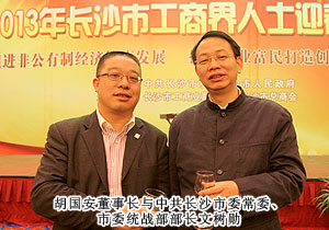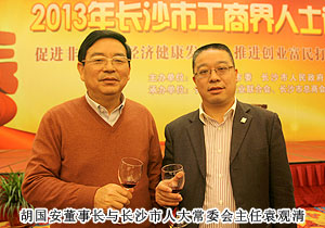“話發(fā)展,謀未來(lái),共迎新春佳節(jié)?!?013年1月23日,中共長(zhǎng)沙市委、市政府舉行2013年長(zhǎng)沙市工商界人士迎春酒會(huì)暨長(zhǎng)沙市第四屆“優(yōu)秀中國(guó)特色社會(huì)主義事業(yè)建設(shè)者”頒獎(jiǎng)典禮。來(lái)自全市各行各業(yè)的600多名工商界人士歡聚一堂,共議長(zhǎng)沙發(fā)展大計(jì)。中共長(zhǎng)沙市委副書(shū)記、市長(zhǎng)張劍飛,中共長(zhǎng)沙市委副書(shū)記張迎龍,長(zhǎng)沙市人大常委會(huì)主任袁觀清等領(lǐng)導(dǎo)出席迎春酒會(huì)。長(zhǎng)沙市工商聯(lián)副主席、第三屆優(yōu)秀中國(guó)特色社會(huì)主義事業(yè)建設(shè)者、綠之韻集團(tuán)董事長(zhǎng)胡國(guó)安主桌就座。