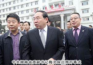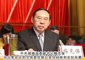 開(kāi)幕式前,中共湖南省委書(shū)記、省人大常委會(huì)主任周強(qiáng),湖南省人民政府省長(zhǎng)徐守盛,中共湖南省委副書(shū)記梅克保,中共湖南省委常委、省軍區(qū)政委李有新,中共湖南省委常委、省委秘書(shū)長(zhǎng)易煉紅,湖南省人大常委會(huì)副主任陳叔紅,省政府副省長(zhǎng)韓永文,省政協(xié)副主席王曉琴等領(lǐng)導(dǎo)親切接見(jiàn)全體青聯(lián)委員并合影留念。省委副書(shū)記梅克保出席開(kāi)幕式并做重要講話(huà)。梅克保指出,實(shí)踐證明,當(dāng)代湖南青年是值得信賴(lài)、堪當(dāng)重任、大有希望的一代。今后五年,是我省全面建設(shè)小康社會(huì)、加快推進(jìn)現(xiàn)代化進(jìn)程的關(guān)鍵時(shí)期。省第十次黨代會(huì)科學(xué)描繪了湖南未來(lái)五年改革發(fā)展的宏偉藍(lán)圖,提出了“四化兩型”的總戰(zhàn)略和“兩個(gè)加快、兩個(gè)率先”的總?cè)蝿?wù)。實(shí)現(xiàn)這一目標(biāo)任務(wù)是全省人民的共同心愿,也需要全省人民團(tuán)結(jié)一心、奮力拼搏。我省青年作為其中最富朝氣最具前途的重要群體,更是義不容辭、責(zé)無(wú)旁貸。