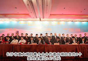 香港長(zhǎng)沙商會(huì)成立儀式后,長(zhǎng)沙市舉行了重大項(xiàng)目推介會(huì)。長(zhǎng)沙高新區(qū)、經(jīng)開區(qū)、武廣高鐵新城和長(zhǎng)沙大河西先導(dǎo)區(qū)等四大作專題推介。長(zhǎng)沙市根據(jù)香港向內(nèi)地產(chǎn)業(yè)轉(zhuǎn)移的趨勢(shì)和香港自身的產(chǎn)業(yè)特色,重點(diǎn)圍繞其國(guó)際金融、創(chuàng)新科技、環(huán)保技術(shù)、高端會(huì)展、高效物流、專業(yè)服務(wù)、影視娛樂、推廣平臺(tái)等產(chǎn)業(yè)優(yōu)勢(shì),推介長(zhǎng)沙市20個(gè)的優(yōu)質(zhì)招商項(xiàng)目。會(huì)上合作意向項(xiàng)目簽約8個(gè),簽約金額達(dá)147億元。