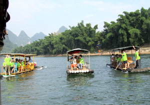 靜靜漓江上,綠之韻營(yíng)銷伙伴乘坐竹筏,一副悠然自得的畫卷應(yīng)景而生。