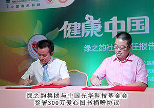 綠之韻集團(tuán)董事長(zhǎng)胡國(guó)安先生與中國(guó)光華科技基金會(huì)簽署300萬愛心圖書捐贈(zèng)戰(zhàn)略協(xié)議將精彩紛呈的發(fā)布會(huì)推向新的高潮,董事長(zhǎng)胡國(guó)安先生承諾將開展“綠之韻愛心圖書館工程”,計(jì)劃用三年時(shí)間,以“綠韻圓夢(mèng)?書香助學(xué)”主題公益活動(dòng)為契機(jī),為湖南、黑龍江等省捐贈(zèng)20所愛心圖書館。