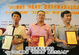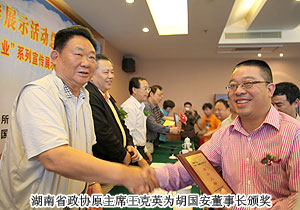 綠之韻集團作為湖南省非公有制經(jīng)濟黨建工作優(yōu)秀典型企業(yè),憑借在積極引導(dǎo)非公經(jīng)濟融入“四化兩型”戰(zhàn)略方面取得的杰出貢獻,經(jīng)各地、各部門和相關(guān)單位的積極推薦、評審,并經(jīng)《湖南日報》公示,董事長胡國安被評為2011湖南省‘四化兩型’建設(shè)杰出人物。2011年兩會期間,湖南省優(yōu)秀政協(xié)委員胡國安在會議上作《積極引導(dǎo)非公有制經(jīng)濟融入“四化兩型”戰(zhàn)略的建議》的報告,該提案獲得中共湖南省委書記、省人大常委會主任周強的重要批示,被納為省經(jīng)信委重要研究課題。