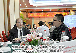 為落實(shí)周強(qiáng)書(shū)記在北京出席中美州長(zhǎng)對(duì)話會(huì)議關(guān)于“開(kāi)創(chuàng)中美省州地方合作新未來(lái)”的精神,推進(jìn)湖南與北卡州簽訂的友好省州協(xié)議內(nèi)容,促進(jìn)湖南與北卡州全面開(kāi)展民間經(jīng)濟(jì)外交,2011年10月20日下午,長(zhǎng)沙—美國(guó)中小企業(yè)合作周(長(zhǎng)沙)項(xiàng)目對(duì)接洽談會(huì)在華天大酒店召開(kāi),由卡羅萊納—中國(guó)友協(xié)董事會(huì)主席,北卡州議員,原美國(guó)農(nóng)業(yè)部副部長(zhǎng)Harris Blake為團(tuán)長(zhǎng)率領(lǐng)的美國(guó)北卡經(jīng)貿(mào)及友好交流訪問(wèn)團(tuán)成員來(lái)長(zhǎng)與長(zhǎng)沙企業(yè)家對(duì)接洽談。長(zhǎng)沙市政協(xié)副主席、市工商聯(lián)主席彭繼球,市僑聯(lián)副主席翁少蘭等領(lǐng)導(dǎo)出席了對(duì)接洽談。繼九月訪美赴北卡州考察與美方企業(yè)有過(guò)初步對(duì)接后,此次綠之韻集團(tuán)胡國(guó)安董事長(zhǎng)再次應(yīng)邀出席合作洽談會(huì)并對(duì)北卡州龐達(dá)地產(chǎn)總裁Mark Herman想建第一座中國(guó)城的項(xiàng)目積極關(guān)注。