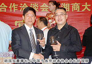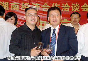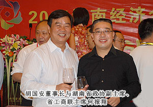 2011年9月28日,2011湖南省經(jīng)濟合作洽談會暨湘商大會在衡陽隆重召開,來自國內(nèi)23個省的54個代表團、42家各地商會的3000余名代表共赴盛會。全國政協(xié)原副主席毛致用、中共湖南省委常委、常務(wù)副省長于來山、國家工商總局副局長鐘攸平,中國個體勞動者協(xié)會會長甘國屏、湖南省政協(xié)副主席、省工商聯(lián)主席何報翔等各級領(lǐng)導(dǎo)出席開幕式。應(yīng)湖南省工商聯(lián)、衡陽市人民政府的邀請,中國青年企業(yè)家協(xié)會常務(wù)理事、湖南省青年企業(yè)家協(xié)會副會長、2009中國十大杰出湘商、綠之韻集團董事長胡國安出席大會。