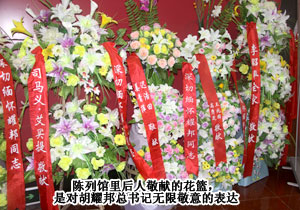 在偉大的無產(chǎn)階級革命家、政治家,原中國共產(chǎn)黨中央委員會總書記胡耀邦故居陳列館里,擺放著大大小小的花籃,那是后人對胡耀邦總書記一生“一身正氣,兩袖清風(fēng)”無限敬意的表達(dá)。中共中央政治局委員、十一屆全國人大常委會副委員長、中華全國總工會主席王兆國,原中華人民共和國中央軍事委員會副主席,國務(wù)委員兼國防部部長遲浩田、中共湖南省委書記、省人大常委會主任周強(qiáng)等領(lǐng)導(dǎo)先后敬獻(xiàn)花籃。胡國安董事長也滿懷對偉大革命家的尊敬之情敬獻(xiàn)花籃,深切緬懷胡耀邦總書記。