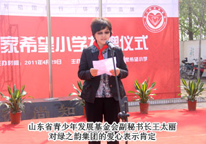山東省青少年基金會(huì)副秘書長王太麗接受捐贈(zèng),并對(duì)綠之韻集團(tuán)對(duì)社會(huì)的人文關(guān)懷表示肯定?;菝窨h人大常委會(huì)副主任張秀奎與綠之韻集團(tuán)胡國安董事長共同為希望小學(xué)揭牌,并向胡國安董事長頒發(fā)了惠民縣榮譽(yù)市民證書。