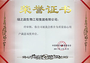 2011年“3?15”國際保護(hù)消費者權(quán)益日之際,中國保護(hù)消費者基金會根據(jù)《消費者權(quán)益保護(hù)法》所賦予的職能和職責(zé),以“誠信、維權(quán)”為年度消費主題而組織的“全國市場放心消費單位”評比活動揭榜。綠之韻集團(tuán)認(rèn)真貫徹執(zhí)行《消費者權(quán)益保護(hù)法》、《產(chǎn)品質(zhì)量法》,嚴(yán)格按照國家的行業(yè)規(guī)定與質(zhì)量標(biāo)準(zhǔn)組織生產(chǎn),經(jīng)過活動組織方及國家相關(guān)部門的層層審查,被中國保護(hù)消費者基金會授予“全國市場放心消費單位”。