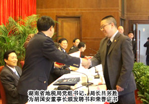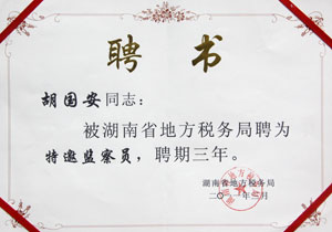 自2008年受聘湖南地稅局特邀監(jiān)查員以來,胡國安董事長認(rèn)真履行職責(zé),了解和反映基層稅務(wù)部門和稅務(wù)人員依法治稅、依法行政的情況,在解決群眾關(guān)心的熱點(diǎn)難點(diǎn)問題,促進(jìn)行風(fēng)政風(fēng)建設(shè)方面取得了良好的效果,得到了地稅系統(tǒng)領(lǐng)導(dǎo)的一致好評。此次會議,胡國安董事長成唯一受聘連任湖南省地稅特邀監(jiān)察員的企業(yè)家。省地稅局黨組書記、局長呂興勝親自頒發(fā)了聘書和榮譽(yù)證書,并勉勵(lì)胡國安董事長認(rèn)真履行職責(zé),積極開展工作,進(jìn)一步加大監(jiān)督力度,為我省黨風(fēng)廉政建設(shè)、優(yōu)化經(jīng)濟(jì)發(fā)展環(huán)境作貢獻(xiàn)。