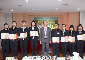 頒獎典禮中,四季度服務(wù)明星、優(yōu)秀服務(wù)集體、年度優(yōu)秀職員、年度優(yōu)秀中層管理干部的表彰讓每一個員工感受到榮譽背后的忠誠、敬業(yè)和專業(yè)。本次頒獎,一份得來不易的殊榮更讓員工們?yōu)閾碛芯G之韻的事業(yè)平臺而驕傲,為表彰鼓勵一直兢兢業(yè)業(yè),勤勤懇懇,愛司如家,對公司發(fā)展做出突出貢獻的優(yōu)秀員工,集團特頒勞動股份期權(quán)獎。本次共有八名優(yōu)秀職員獲2011年度勞動股份期權(quán)(五年期)特別嘉獎,四名優(yōu)秀職員獲2011年度勞動股份期權(quán)(三年期)特別嘉獎。胡國安董事長親自為他們頒獎,并在總結(jié)發(fā)言中表示:或許你現(xiàn)在還離優(yōu)秀差一步,但只要你們再努力,勇敢地向優(yōu)秀邁進,所有表現(xiàn)優(yōu)秀的職員都能在今后的努力中獲此殊榮。同時,胡國安董事長清晰地為員工們規(guī)劃職業(yè)生涯,讓綠之韻的每一位員工都能將才能最大化、價值最大化。