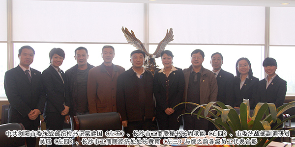 2010年12月1日,就綠之韻集團董事長胡國安參評“第三屆長沙市優(yōu)秀中國特色社會主義事業(yè)建設(shè)者”評選活動事宜,中共長沙市委統(tǒng)戰(zhàn)部紀檢書記粟建國、副調(diào)研員吳玨、長沙市工商聯(lián)秘書長周承能、經(jīng)濟處處長黃羽一行蒞臨綠之韻集團實地考察,綠之韻集團董事常務副總裁勞嘉、董事長助理戴曉彥全程陪同。