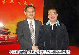2010年11月15日—25日,應(yīng)印度青年事務(wù)與體育部的邀請,以共青團(tuán)中央書記處書記盧雍政為團(tuán)長的百人中國青年代表團(tuán)訪問印度。代表團(tuán)成員共有100人,包括團(tuán)中央、各部委、各省市和部門的團(tuán)委負(fù)責(zé)人,文化、教育、新聞界青年代表、青年企業(yè)家等。中國優(yōu)秀民營企業(yè)家、湖南省優(yōu)秀青年企業(yè)家、綠之韻集團(tuán)董事長胡國安應(yīng)邀隨中國青年代表團(tuán)同行,并受到中國駐印度大使張焱的親切接見。