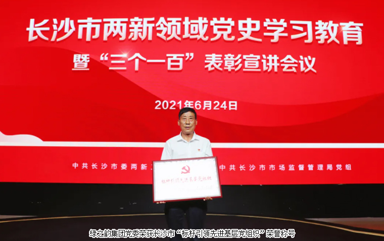 2021年6月24日,長沙市兩新領(lǐng)域黨史學(xué)習(xí)教育暨“三個(gè)一百”表彰宣講會(huì)召開。中共長沙市委常委、市委組織部部長張宏益,市政協(xié)副主席、民盟市委主委、市市場監(jiān)督管理局局長張慶和,中共長沙市委組織部副部長、兩新工委書記、基層辦主任楊俊,市民政局黨委書記、局長、市委兩新工委副書記陳昌佳,市市場監(jiān)督局黨組書記、市委兩新工委副書記邱山東,市委兩新工委專職副書記肖劍鋒等領(lǐng)導(dǎo)出席會(huì)議。綠之韻集團(tuán)黨委副書記許達(dá)仲參加會(huì)議。會(huì)上,綠之韻集團(tuán)黨委榮獲長沙市“標(biāo)桿引領(lǐng)先進(jìn)基層黨組織”榮譽(yù)稱號。