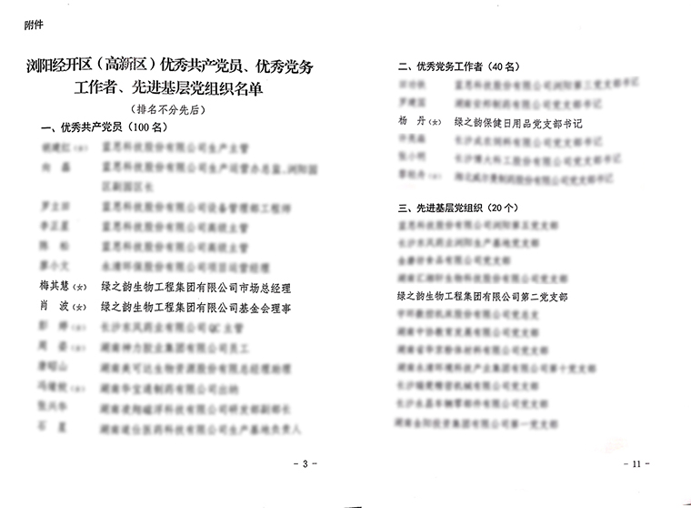 瀏陽經(jīng)開區(qū)(高新區(qū))黨工委委員、管委會副主任何六生主持會議。會議伊始,全體起立,奏唱國歌。會上,瀏陽經(jīng)開區(qū)(高新區(qū))黨工委委員、管委會副主任羅其勝宣讀表彰文件。與會領(lǐng)導(dǎo)為獲得表彰的優(yōu)秀集體和個人頒獎。會上,綠之韻集團二支部憑借出色的黨建工作被中共瀏陽經(jīng)濟技術(shù)開發(fā)區(qū)工作委員會評為“先進基層黨組織”;黨員楊丹被評為“優(yōu)秀黨務(wù)工作者”;黨員梅其慧、肖波被評為“優(yōu)秀共產(chǎn)黨員”。