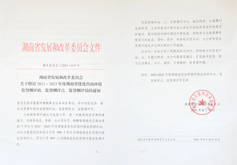 為加強(qiáng)營(yíng)商環(huán)境社會(huì)監(jiān)督工作,進(jìn)一步推進(jìn)我省營(yíng)商環(huán)境建設(shè),經(jīng)企業(yè)申請(qǐng)和單位推薦報(bào)名,通過(guò)相關(guān)部門(mén)審核和公示公開(kāi),經(jīng)湖南省優(yōu)化經(jīng)濟(jì)發(fā)展環(huán)境聯(lián)席會(huì)議辦公室研究,綠之韻集團(tuán)獲評(píng)“2021-2023年度湖南省優(yōu)化營(yíng)商環(huán)境監(jiān)督測(cè)評(píng)點(diǎn)”,綠之韻集團(tuán)副總裁胡均安獲評(píng)“湖南省優(yōu)化營(yíng)商環(huán)境監(jiān)督測(cè)評(píng)員”。