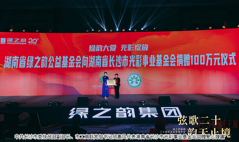 馭時(shí)而進(jìn),廿載逐光;回溯往昔,心懷感恩;繼往開來,至臻致遠(yuǎn)。創(chuàng)立20年來,綠之韻積極承擔(dān)企業(yè)公民責(zé)任,熱心公益事業(yè)。公益路上,綠之韻的事業(yè)伙伴中也涌現(xiàn)出眾多的向善向上的力量,瑞僖金融、綠之韻三十九鋪、云來科技、綠之韻低碳、綠之韻碧波庭、綠之韻數(shù)字化健康科技、綠之韻幸福國際、綠之韻微看等憑借積極投身公益獲得綠之韻“20年公益大使獎(jiǎng)”。湖南省工商聯(lián)(總商會)黨組成員、副主席漆平波,中共長沙市委統(tǒng)戰(zhàn)部副部長、市僑辦主任楊光華上臺為獲得者頒獎(jiǎng)。晚會現(xiàn)場,勞嘉理事長代表綠之韻公益基金會向湖南省長沙市光彩事業(yè)基金會捐贈100萬元愛心支票,中共長沙市委統(tǒng)戰(zhàn)部副部長、市工商聯(lián)黨組書記何惠風(fēng)向綠之韻公益基金會回贈愛心牌匾。該筆愛心善款將用于鄉(xiāng)村振興、幫扶濟(jì)困等光彩事業(yè),為需要幫助的人送去溫暖和希望。