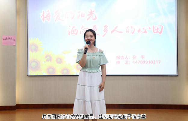 隨后,共青團長沙市委黨組成員、掛職副書記何平,以自身經(jīng)歷為例,為大家分享了她的勵志故事。參加工作之后,她長期致力于青少年公益事業(yè),先后在39所少年宮和學校開設(shè)了“向日葵姐姐·心靈熱線”等服務(wù),六七年來,共接到聽眾來電1300多人次,回復(fù)郵件和信件4000多封,QQ訪問量達50多萬人,先后資助了70余位貧困學生。雖然生活給予了她比常人更多的磨難,但她用自己的親身經(jīng)歷鼓勵大家,要保持陽光的心態(tài),伸出愛的雙手,把愛灑向更多人的心田。