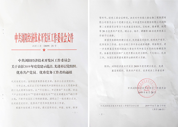 2019年6月27日,瀏陽經(jīng)開區(qū)黨工委在瀏陽金陽文化藝術(shù)中心召開2019年“七一”表彰大會。瀏陽經(jīng)開區(qū)黨工委書記郭力夫,瀏陽經(jīng)開區(qū)黨工委副書記、管委會主任談文昌以及全體黨委領(lǐng)導(dǎo)、機關(guān)黨員、非公經(jīng)濟黨組織負責人、優(yōu)秀黨員和2019年度新發(fā)展的預(yù)備黨員參加會議。綠之韻集團黨委書記劉云、黨委副書記許達仲帶領(lǐng)集團優(yōu)秀黨務(wù)工作者、優(yōu)秀黨員、預(yù)備黨員參加會議。