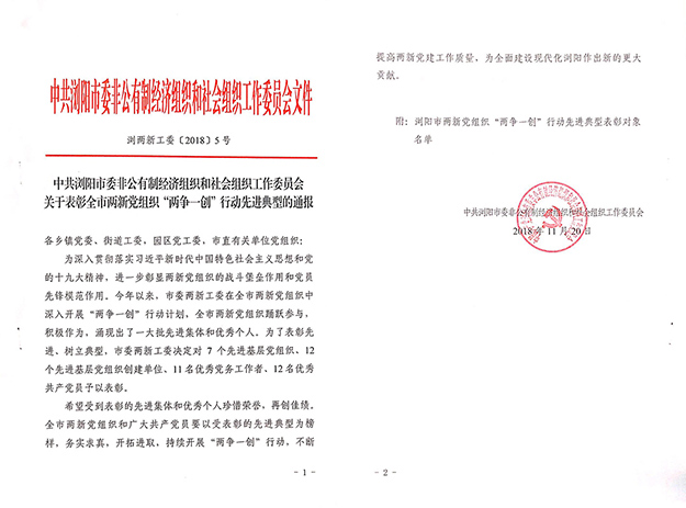 瀏陽市委兩新工委在全市兩新黨組織中組織開展“兩爭一創(chuàng)”行動先進典型評選,旨在深入貫徹落實新時代中國特色社會主義思想和黨的十九大精神,彰顯兩新黨組織戰(zhàn)斗堡壘作用和黨員先鋒模范作用。湖南綠之韻保健日用品有限公司黨支部憑借出色的黨建工作,經(jīng)基層推薦、差額比選、組織考察、綜合會審,并經(jīng)市委兩新工委會議研究,被評為瀏陽市兩新黨組織“兩爭一創(chuàng)”行動“先進基層黨組織創(chuàng)建單位”,中共瀏陽市委常委、組織部部長周文舜給獲獎的先進集體頒獎。