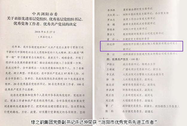 2018年6月29日,瀏陽(yáng)經(jīng)開(kāi)區(qū)慶祝中國(guó)共產(chǎn)黨建黨97周年暨“黨建示范點(diǎn) 優(yōu)秀共產(chǎn)黨員”表彰活動(dòng)在園區(qū)金陽(yáng)文化藝術(shù)中心舉行。長(zhǎng)沙市委組織部副部長(zhǎng)、長(zhǎng)沙市兩新工委書(shū)記、長(zhǎng)沙市績(jī)效辦主任易敏華,長(zhǎng)沙市兩新工委辦公室主任楊立志;瀏陽(yáng)經(jīng)開(kāi)區(qū)黨工委書(shū)記郭力夫,瀏陽(yáng)經(jīng)開(kāi)區(qū)黨工委副書(shū)記、管委會(huì)主任談文昌等領(lǐng)導(dǎo)參加會(huì)議。綠之韻集團(tuán)黨委書(shū)記劉云帶領(lǐng)集團(tuán)優(yōu)秀黨員和2018年度新發(fā)展的預(yù)備黨員參加會(huì)議。會(huì)上,綠之韻集團(tuán)保健日用品支部憑借出色的黨建工作被評(píng)為“黨建示范點(diǎn)”。綠之韻集團(tuán)黨委副書(shū)記許達(dá)仲榮獲“瀏陽(yáng)市優(yōu)秀黨務(wù)先進(jìn)工作者”。