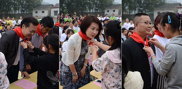 愛心助學(xué)儀式上,月山學(xué)校校長(zhǎng)李勇翔致歡迎詞:“時(shí)隔一年時(shí)間,感謝綠之韻集團(tuán)對(duì)我校及孩子們的關(guān)愛,感謝綠之韻的家人們依然心存愛心,記得月山太平中學(xué)的孩子們。學(xué)校也會(huì)不辜負(fù)大家的希望,好好教育好學(xué)生,培養(yǎng)出更多對(duì)社會(huì)有用有愛心的的棟梁之才。”隨后,可愛的孩子們?yōu)槌鱿顒?dòng)的領(lǐng)導(dǎo)、嘉賓以及綠之韻集團(tuán)的愛心經(jīng)銷商和志愿者們系上鮮艷的紅領(lǐng)巾,借此表達(dá)他們的無限感激之情。