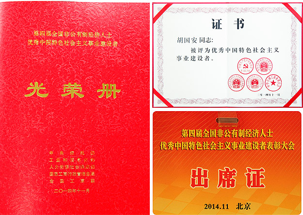本次表彰大會由中央統(tǒng)戰(zhàn)部、工業(yè)和信息化部、人力資源和社會保障部、國家工商總局和全國工商聯(lián)共同舉辦。100名非公有制經濟人士和其他新的社會階層人士受到表彰。自2003年創(chuàng)立綠之韻集團以來,胡國安董事長堅決擁護中國共產黨的領導和社會主義制度,擁護黨的路線、方針、政策,堅定走中國特色社會主義道路,貫徹落實科學發(fā)展觀,企業(yè)管理制度完善、資質質量較高、財務狀況良好。黨、團、工會組織健全并發(fā)揮了較好作用,做到愛國、敬業(yè)、誠信、守法、貢獻,在本地區(qū)和同行業(yè)中起表率作用。同時,在以下某些方面表現(xiàn)突出:一是積極履行社會責任、安全生產、節(jié)能減排、保護環(huán)境、關愛員工、誠實守信以及參與光彩事業(yè)和社會公益事業(yè),支持和服務抗擊自然災害;二是積極創(chuàng)立自主品牌和自主知識產權、發(fā)明專利、新產品開發(fā)、新技術推廣等;三是在企業(yè)文化建設、遵守社會公德和職業(yè)道德、追求和實踐大健康文明的生活方式、社會影響、社會形象等方面有著突出表現(xiàn)。