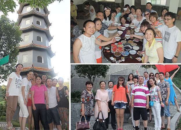 湖南省安化縣冷市鎮(zhèn)小九溪村,胡國安董事長的家鄉(xiāng)。大巴車沿著胡國安董事長為家鄉(xiāng)捐資修建的水泥路蜿蜒前行,深掩在崇山之間的“綠韻山莊”讓大家充滿期待。從一間木質(zhì)結(jié)構(gòu)的小房屋,到三棟主樓聳立的大宅院,這里面包含著胡國安董事長成功的縮影。下了車,大家紛紛駐足在綠韻山莊平面示意圖前,樂開了鍋。這哪是家宅?分明就是一個度假村。明珠觀音塔、明珠閣、長城、怡然亭、游泳池、健身園、野生獼猴桃園……一整座山,構(gòu)成了綠韻山莊,也承載了董事長為家爭光的夢想。