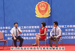 湖南省打擊傳銷(xiāo)工作聯(lián)席會(huì)議辦公室主任、湖南省工商局副局長(zhǎng)魯先華,湖南省打擊傳銷(xiāo)工作聯(lián)席會(huì)議辦公室副主任、湖南省經(jīng)濟(jì)檢查總隊(duì)總隊(duì)長(zhǎng)毛愛(ài)倫,湖南省經(jīng)濟(jì)檢查總隊(duì)副總隊(duì)長(zhǎng)肖向陽(yáng),長(zhǎng)沙市工商局黨組書(shū)記、局長(zhǎng)卓精華,長(zhǎng)沙市工商局黨組副書(shū)記、副局長(zhǎng)潘虹,長(zhǎng)沙縣人民政府副縣長(zhǎng)、公安局長(zhǎng)曾衛(wèi)國(guó),長(zhǎng)沙縣工商局黨組書(shū)記、局長(zhǎng)舒曲等領(lǐng)導(dǎo)和嘉賓蒞臨活動(dòng)現(xiàn)場(chǎng)指導(dǎo)。綠之韻集團(tuán)受邀參與此次活動(dòng),湖南分公司代表、高級(jí)經(jīng)銷(xiāo)商蘇龍輝先后與主持人、居民朋友進(jìn)行一問(wèn)一答式互動(dòng),贏得了現(xiàn)場(chǎng)陣陣熱烈的掌聲。